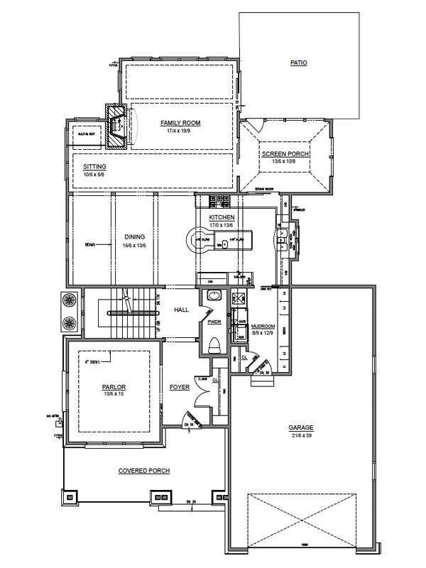 - First floor features 10 foot ceilings and contains a large mudroom with custom built-in cabinetry and laundry facilities, powder room, parlor leading to front porch, gourmet kitchen opening to a large dining area, and family room with fireplace, beamed ceiling, separate sitting area with built-in game table, and extensive glass facing rear yard and golf course